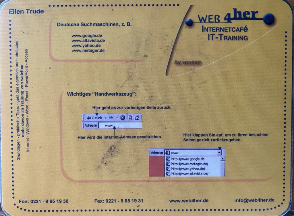 Das Fraueninternetcafé „web4her“ von Ellen Trude bot Schulungen und Seminare rund um das Thema Internet, Grundlagen von Emailverkehr und dem Textprogramm Word. Frauen, die keinen PC oder Internetzugang hatten, konnten die Anwendungen hier nutzen.