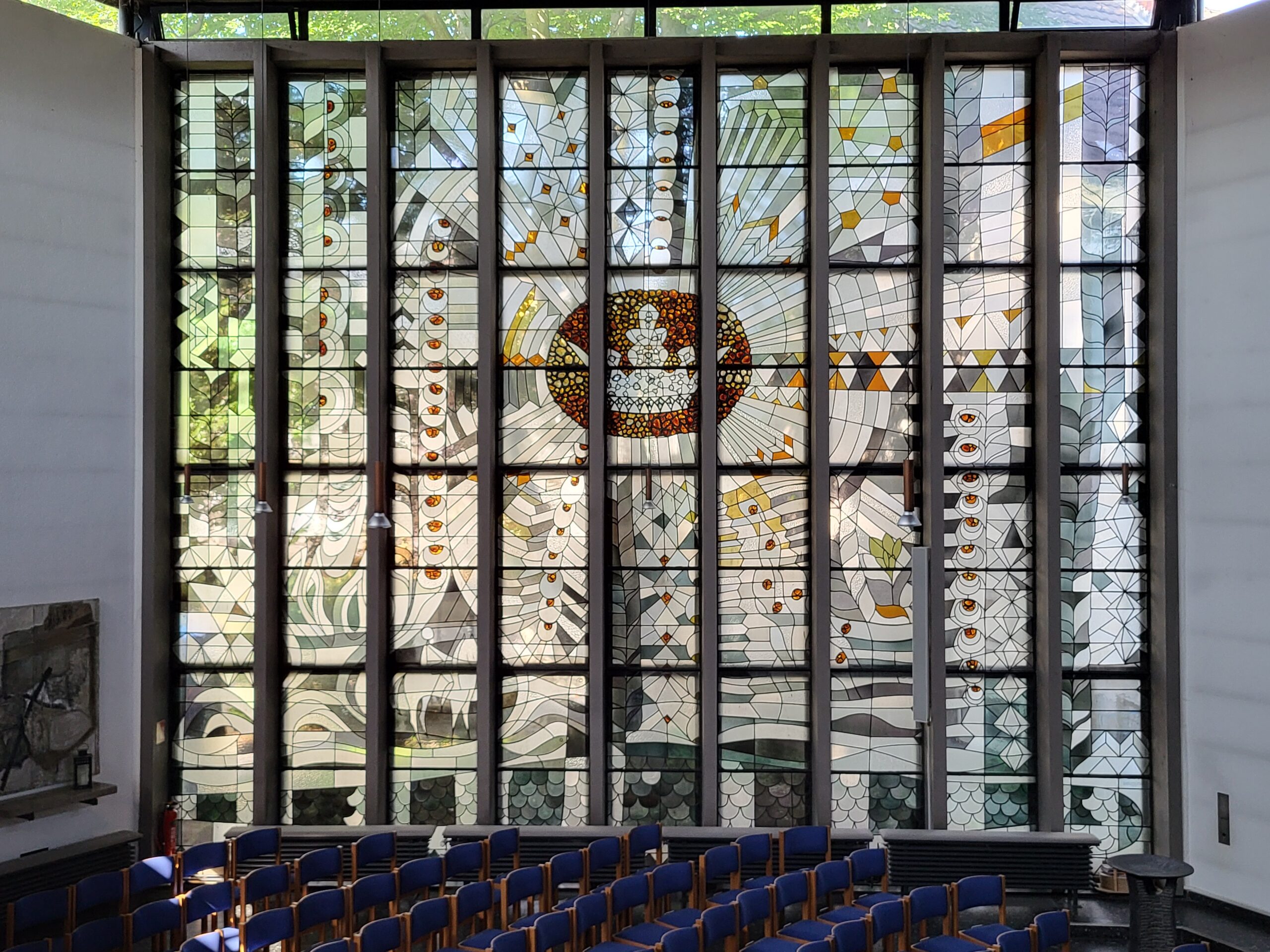 Das von Elfriede Fulda gestaltete Betonglasfenster für die Kapelle von Haus Wiesengrund in Überdorf bei Nümbrecht wurde 1965 eingeweiht und ist während der Öffnungszeiten zu bewundern.
