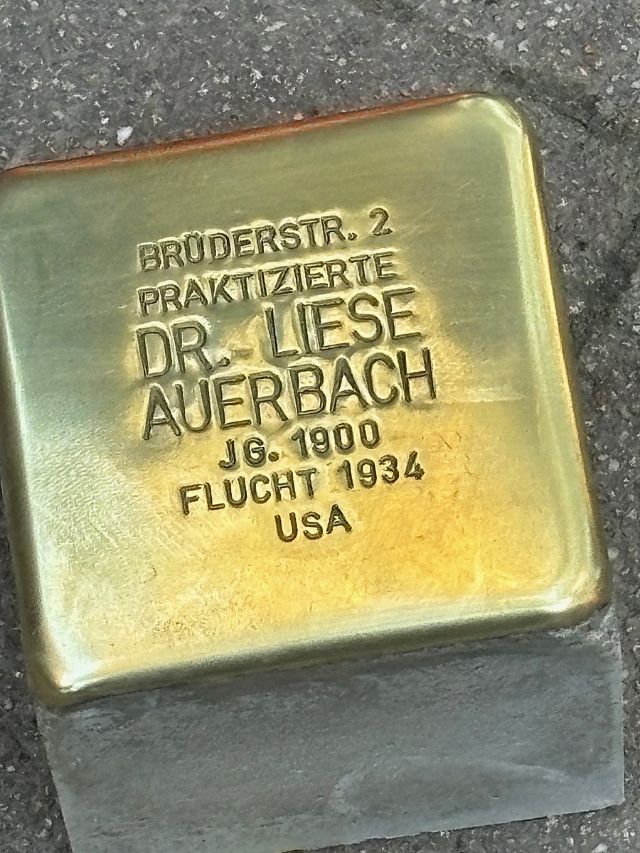 Seit 2014 erinnert ein Stolperstein in der Brüderstraße 2 an das Schicksal der Jüdin Lisbeth (Liese) Auerbach, der vermutlich ersten Kölner Internistin. Sie überlebte die Zeit des Nationalsozialismus, weil sie NS-Deutschland schon frühzeitig verlassen hat. In New York fand sie eine neue Heimat und konnte dort auch beruflich wieder Fuß fassen.